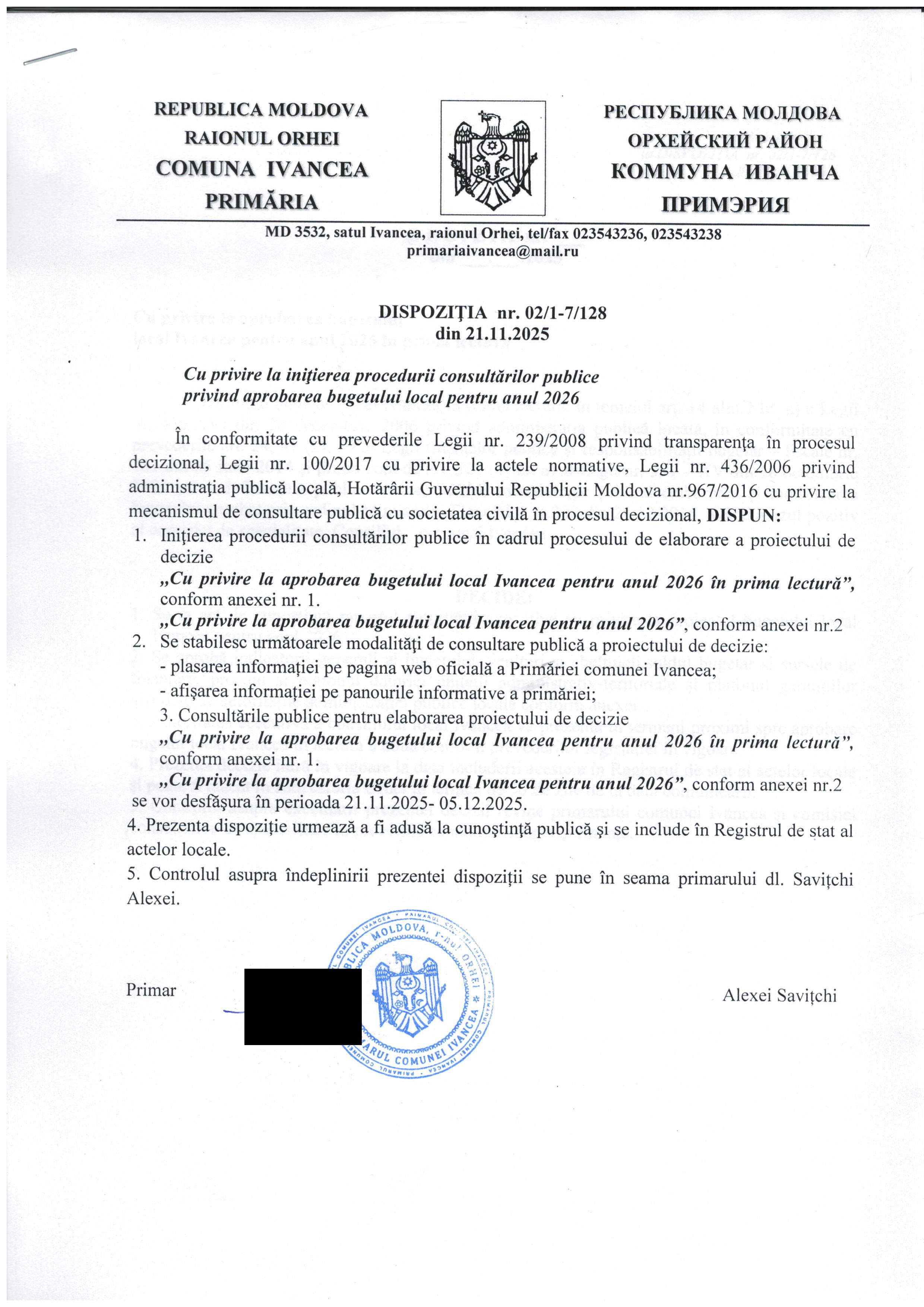 ANUNȚ! Consultări publice privind aprobarea bugetului pentru anul 2026 Dispoziția nr. 02/1-7/128 din 21.11.2025 Cu privire la inițierea procedurii consultărilor publice privind aprobarea bugetului local pentru anul 2026 Anexa nr. 1 la Dispoziția nr. 02/1-7/128 din 21.11.2025 Cu privire la aprobarea bugetului local Ivancea pentru anul 2026